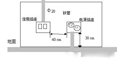 所有信息接口﹙插座﹚均采用RJ45模塊, RJ45埋入式信息插座與其旁邊電源插座應保持0.4m的距離,公共場所的信息接口﹙插座﹚下沿距地0.3m嵌墻暗裝。所有線路均在線槽、樓板內、墻內及吊頂內等處暗敷設。